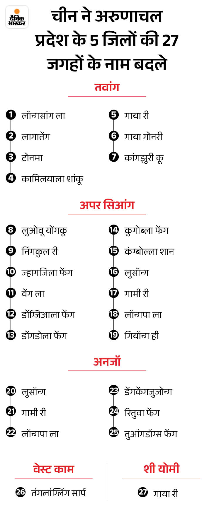 चीन ने इसी साल मई में अरुणाचल की 27 जगहों के नाम बदले हैं। इनमें 15 पहाड़, 5 कस्बे, 4 पहाड़ी दर्रे, 2 नदियां और एक झील शामिल है।