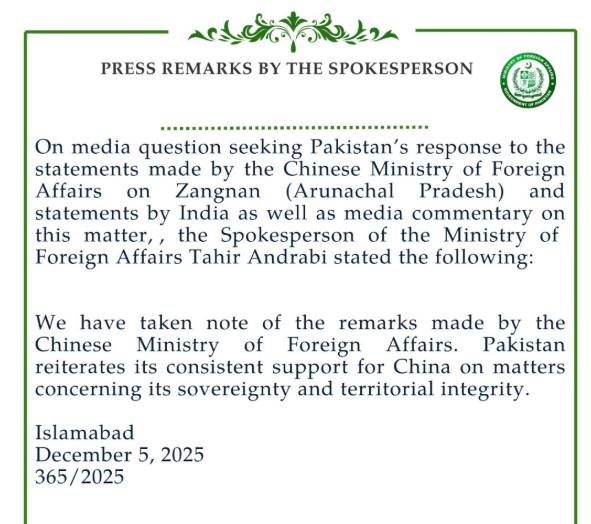 पाकिस्तान ने एक बार फिर चीन के अरुणाचल प्रदेश पर दावे का खुलकर समर्थन किया है। शुक्रवार को पाकिस्तानी विदेश मंत्रालय के प्रवक्ता ताहिर अंद्राबी ने 5 दिसंबर को प्रेस ब्रीफिंग में कहा, ‘चीन की संप्रभुता और क्षेत्रीय अखंडता से जुड़े हर मुद्दे पर पाकिस्तान का लगातार और पूरा समर्थन चीन के साथ है।’