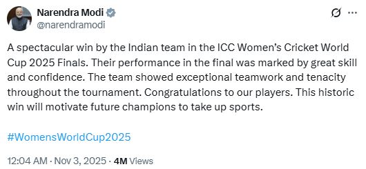इससे पहले, वर्ल्ड कप जीत के बाद प्रधानमंत्री मोदी ने सोशल मीडिया पर खिलाड़ियों को बधाई दी थी। सोशल मीडिया पर लिखा, ICC विमेंस क्रिकेट वर्ल्ड कप 2025 के फाइनल में भारतीय टीम की शानदार जीत। फाइनल में उनका प्रदर्शन अद्भुत कौशल और आत्मविश्वास से भरा था। टीम ने पूरे टूर्नामेंट में असाधारण टीम वर्क और दृढ़ता दिखाई। हमारी खिलाड़ियों को बधाई। यह ऐतिहासिक जीत भविष्य के चैंपियन खिलाड़ियों को खेलों में शामिल होने के लिए प्रेरित करेगी।