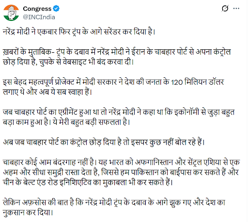 कांग्रेस ने शुक्रवार को आरोप लगाया कि पीएम मोदी ने ट्रम्प के दबाव पर ईरान के चाबहार पोर्ट से कंट्रोल छोड़ दिया है। पार्टी ने एक्स पर लिखा- मोदी सरकार ने चाबहार प्रोजेक्ट में देश की जनता के 120 मिलियन डॉलर (करीब 1100 करोड़ रुपए) लगाए थे। अब ये बर्बाद हो चुके हैं।