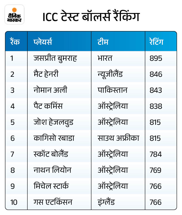 बुमराह टॉप पर कायम टेस्ट बॉलर्स रैंकिंग जसप्रीत बुमराह टॉप पर बने हुए हैं। दूसरे नंबर पर मैट हेनरी बने हुए हैं। साउथ अफ्रीका के साइमन हार्मर ने चार-चार विकेट की दो बेहतरीन स्पेल के बाद 20 स्थान की बड़ी छलांग लगाकर 24वीं रैंक हासिल कर ली है। भारत के कुलदीप यादव दो स्थान ऊपर बढ़कर 13वें नंबर पर और रवींद्र जडेजा चार स्थान चढ़कर 15वें नंबर पर पहुंच गए हैं।