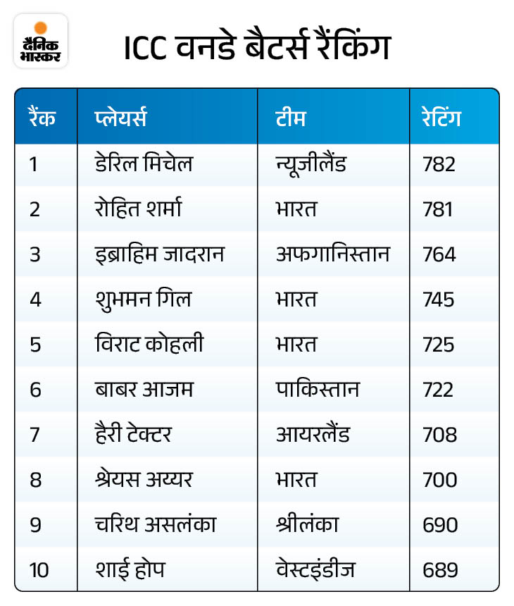 मिचेल ने वेस्टइंडीज के खिलाफ शतक लगाया क्राइस्टचर्च में वेस्टइंडीज के खिलाफ पहले वनडे में डेरिल मिचेल ने 118 गेंदों पर 119 रन की शानदार पारी खेली थी। इसी प्रदर्शन के चलते उन्होंने रोहित शर्मा और अफगानिस्तान के इब्राहिम जादरान को पीछे छोड़ दिया। वर्तमान रेटिंग में मिचेल 782 अंकों के साथ नंबर-1 पर हैं, जबकि रोहित शर्मा 781 अंकों के साथ दूसरे स्थान पर हैं।