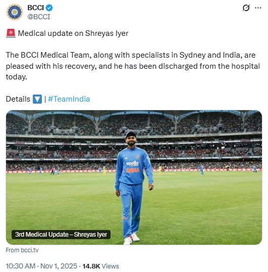 भारतीय उप कप्तान श्रेयस अय्यर हॉस्पिटल से डिस्चार्ज हो गए हैं। BCCI ने शनिवार को यह जानकारी दी। वे पिछले एक सप्ताह से सिडनी के एक हॉस्पिटल में एडमिट थे। अय्यर 25 अक्टूबर को सिडनी में खेले गए तीसरे वनडे में चोटिल हो गए थे।