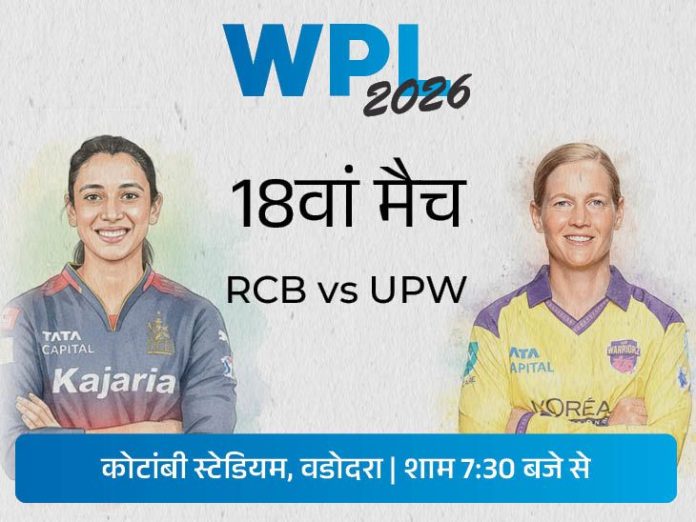 विमेंस प्रीमियर लीग (WPL) 2026 का 18वां मुकाबला आज रॉयल चैलेंजर्स बेंगलुरु (RCB) और यूपी वॉरियर्स (UPW) के बीच खेला जाएगा। यह मुकाबला वडोदरा के कोटांबी स्टेडियम में शाम 7:30 बजे से शुरू होगा।