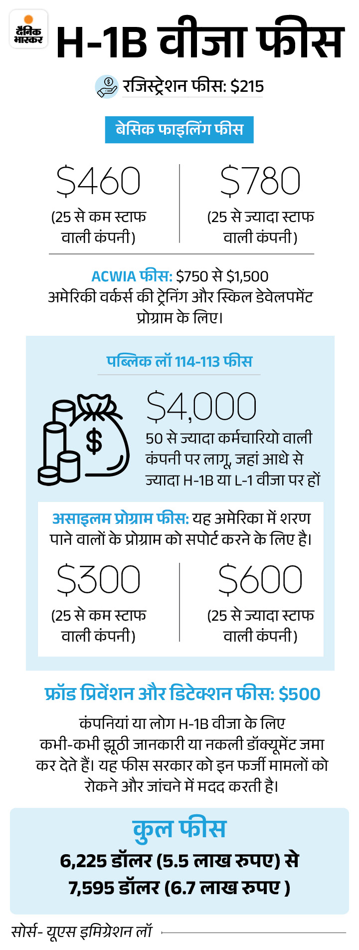 H-1B वीजा के लिए पहले 5.5 से 6.7 लाख रुपए लगते थे। यह 3 साल के लिए मान्य होता था। इसे दोबारा फीस देकर अगले 3 साल के लिए रिन्यू किया जा सकता था। यानी अमेरिका में 6 साल रहने के लिए H-1B वीजा का कुल खर्च 11 से 13 लाख रुपए के करीब बैठता था।