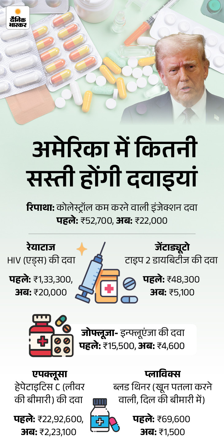 इससे विदेशी देशों को भी ज्यादा कीमत चुकानी पड़ेगी, जैसे ब्रिटेन के साथ हुए समझौते में नई दवाओं की कीमत 25% बढ़ाई गई है। अमेरिकी मरीजों को दवाएं सस्ती मिलेंगी, कंपनियों का एक्स्ट्रा पैसा अमेरिका वापस आएगा और देश में दवा बनाने का काम बढ़ेगा।