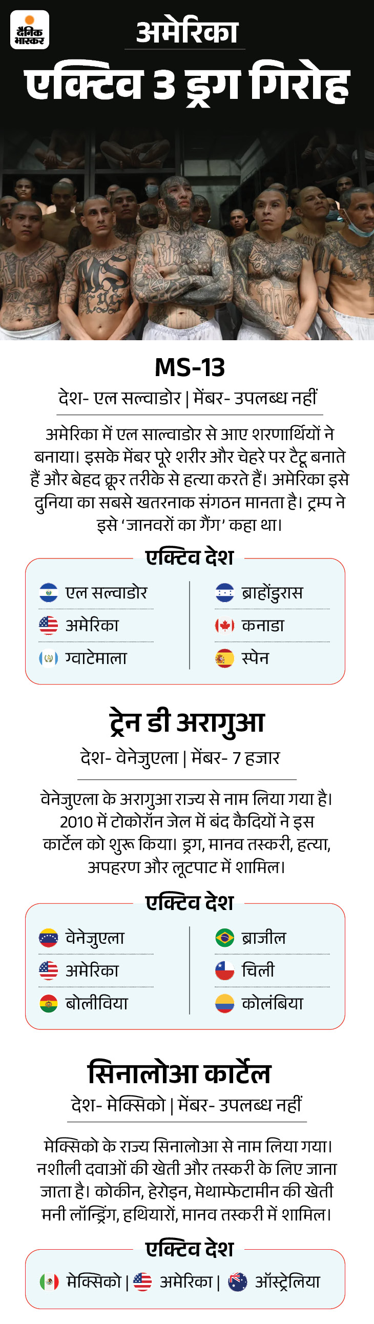 फरवरी 2025 में, अमेरिकी विदेश विभाग ने 6 मेक्सिकन कार्टेल्स, MS-13 गैंग और वेनेज़ुएला के ‘ट्रेन डे अरागुआ’ को विदेशी आतंकी संगठन घोषित किया था।