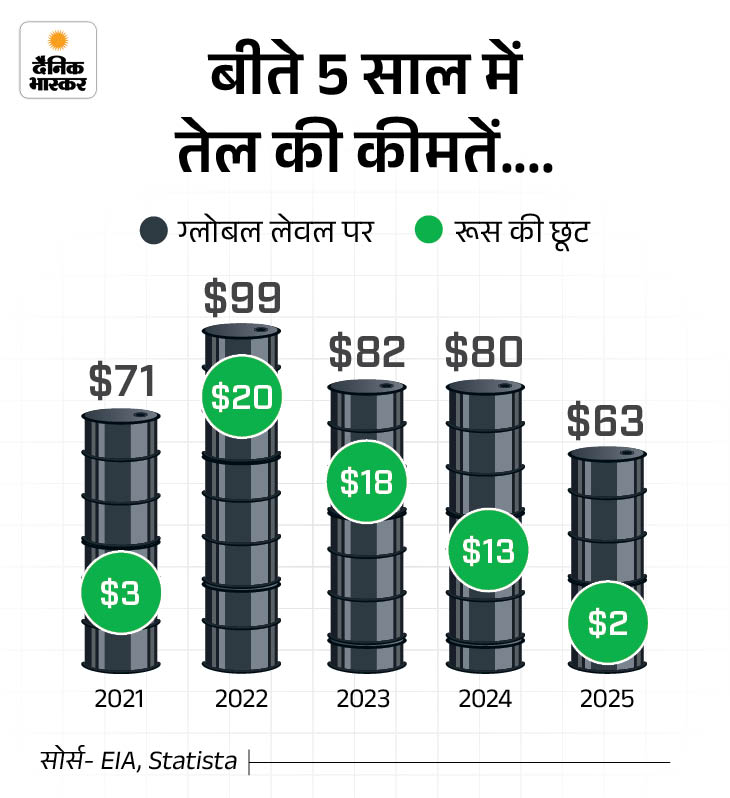 यूक्रेन युद्ध के बाद रूस ने 20-25 डॉलर प्रति बैरल सस्ता क्रूड ऑयल बेचना शुरू किया। तब अंतरराष्ट्रीय मार्केट में कच्चे तेल की कीमत 130 डॉलर प्रति बैरल थी, ऐसे में ये छूट भारत के लिए किफायती थी।