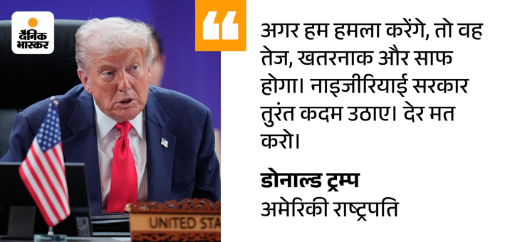 ट्रम्प ने ट्रुथ सोशल पर लिखा कि अगर जरूरत पड़ी, तो अमेरिका ‘गन के साथ’ नाइजीरिया में कार्रवाई करेगा और उन आतंकियों को खत्म करेगा जो ईसाइयों पर हमला कर रहे हैं। ट्रम्प ने कहा कि उन्होंने अपने डिपार्टमेंट ऑफ वॉर को संभावित सैन्य कार्रवाई की तैयारी के आदेश दे दिए हैं।