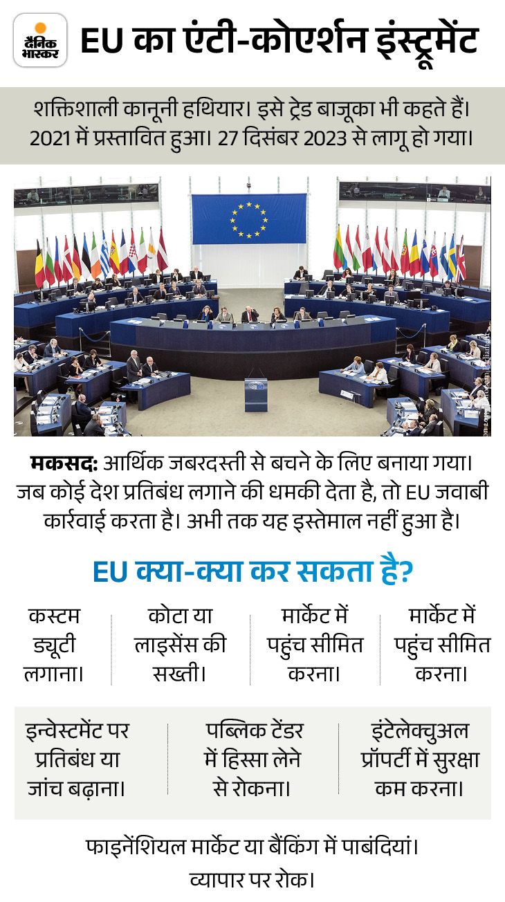 इसके लिए EU एक खास कानूनी हथियार के इस्तेमाल पर सोच रहा है, जिसे अनौपचारिक तौर पर ‘ट्रेड बाजूका’ कहा जाता है। इसका मकसद उन देशों के खिलाफ कड़ा कदम उठाना है, जो यूरोपीय देशों पर जबरदस्ती आर्थिक दबाव बनाने की कोशिश करते हैं।