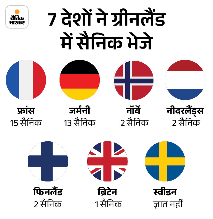 इसके लिए यूरोपीय देशों में फ्रांस ने 15 सैनिक ग्रीनलैंड भेजे हैं, जो 27वीं माउंटेन इन्फैंट्री ब्रिगेड से हैं। जर्मनी ने 13 सैनिकों की एक टीम भेजी है। नॉर्वे, नीदरलैंड और फिनलैंड ने दो-दो सैनिक तैनात किए हैं।