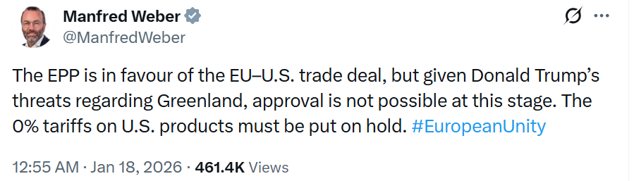 मैनफ्रेड वेबर ने सोशल मीडिया पर कहा कि EPP व्यापार समझौते के पक्ष में था, लेकिन ट्रम्प की ग्रीनलैंड धमकियों के कारण अब मंजूरी संभव नहीं। उन्होंने अमेरिकी उत्पादों पर 0% टैरिफ को होल्ड करने की बात कही।
