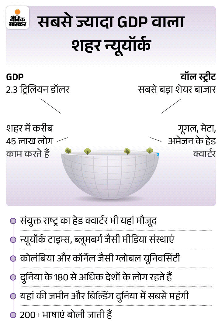 न्यूयॉर्क की सालाना GDP करीब 2.3 ट्रिलियन डॉलर है। यानी कि अकेला न्यूयॉर्क सिटी, पूरे भारत की GDP के आधे से भी ज्यादा है। न्यूयॉर्क का मेयर शहर के प्रशासन, पुलिस, ट्रांसपोर्ट, हाउसिंग, एजुकेशन और हेल्थ सिस्टम पर कंट्रोल रखता है।