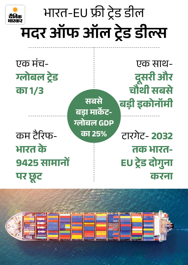 भारत और यूरोपियन यूनियन ने मंगलवार को फ्री ट्रेड एग्रीमेंट पर साइन किए। इसे ‘मदर ऑफ ऑल डील्स’ बताया जा रहा है। इस समझौते से करीब 2 अरब लोगों का बाजार बनेगा और यह वैश्विक GDP के लगभग 25% हिस्से को कवर करेगा।
