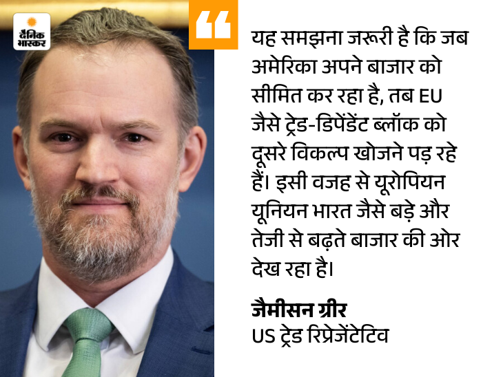 भारत और यूरोपीय यूनियन (EU) के बीच हुए फ्री ट्रेड एग्रीमेंट (FTA) पर अमेरिकी ट्रेड अधिकारी जैमीसन ग्रीर ने कहा है कि इस समझौते का सबसे बड़ा फायदा भारत को मिलने वाला है। उनके मुताबिक, यह डील कई मायनों में भारत के पक्ष में झुकी हुई है।