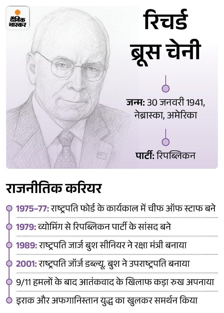 पूर्व अमेरिकी उपराष्ट्रपति डिक चेनी का 84 साल की उम्र में निधन हो गया है। परिवार ने मंगलवार को बयान जारी कर कहा कि डिक चेनी का निधन निमोनिया और दिल से जुड़ी बीमारी की वह से हुआ।