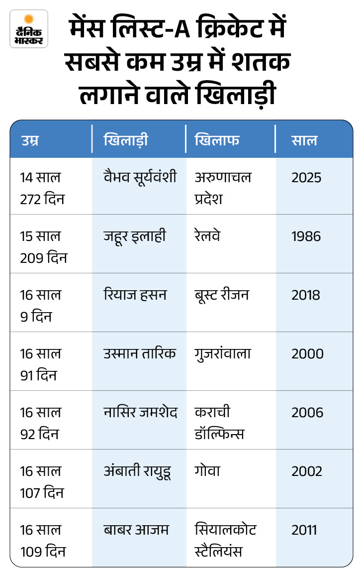 जहूर इलाही ने साल 1986 में विल्स कप के दौरान पाकिस्तान ऑटोमोबाइल्स की ओर से खेलते हुए रेलवे के खिलाफ लिस्ट-A क्रिकेट में शतक जड़ा था। तब उनकी उम्र सिर्फ 15 साल 209 दिन थी। वैभव ने अब 14 साल 272 दिन की उम्र में शतक ठोक सबसे कम उम्र में शतक बनाने का रिकॉर्ड अपने नाम कर लिया है।