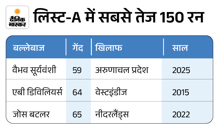 वैभव ने 84 बॉल पर 190 रन बनाए 14 साल के वैभव बिहार के लिए विजय हजारे ट्रॉफी के प्लेट ग्रुप मैच में खेल रहे थे। यह मैच अरुणाचल प्रदेश के खिलाफ रांची के JSCA ओवल ग्राउंड में हुआ। वैभव ने सिर्फ 36 गेंदों में अपना शतक पूरा कर लिया। उन्होंने 84 बॉल पर 190 रन बनाए। वैभव बिहार टीम के उप-कप्तान भी हैं। उन्होंने अपनी पारी में अब तक 16 चौके और 15 छक्के लगाए। उन्होंने 12वें ओवर की पहली गेंद पर एक रन लेकर अपना शतक पूरा किया। वैभव ने सबसे तेज 150 रन बनाते हुए साउथ अफ्रीका के एबी डिविलियर्स और इंग्लैंड के जोस बटलर को पछाड़ दिया।