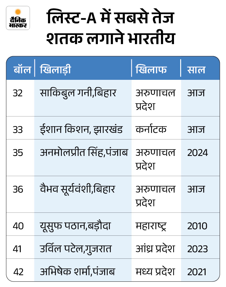 इससे पहले यह रिकॉर्ड अनमोलप्रीत सिंह के नाम था, जिन्होंने 2024 में पंजाब की ओर से अरुणाचल प्रदेश के खिलाफ 35 गेंदों में शतक लगाया था। वहीं, वैभव सूर्यवंशी ने आज अरुणाचल प्रदेश के खिलाफ 36 गेंदों में शतक जड़कर इस खास सूची में अपना नाम दर्ज करा लिया है।