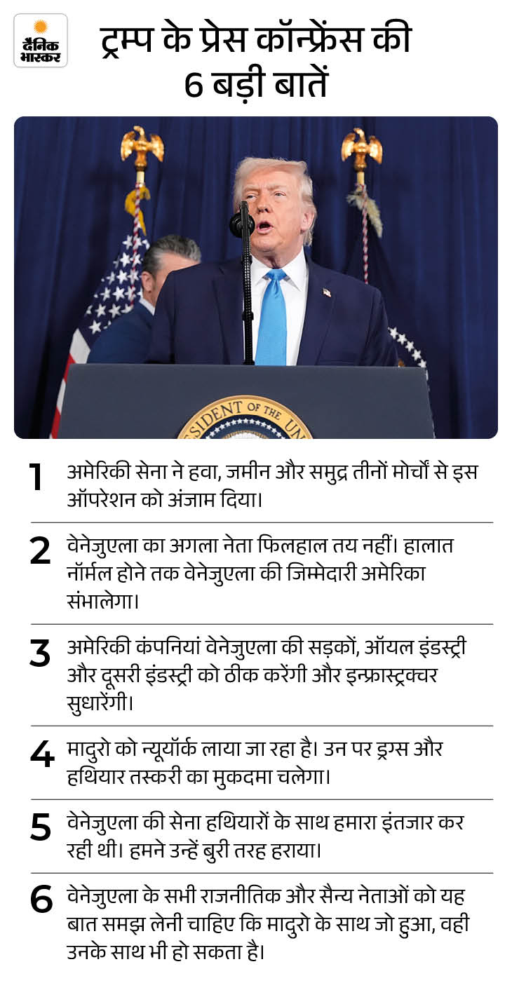 ट्रम्प ने कहा है कि जब तक वेनेजुएला के हालात ठीक नहीं हो जाते तब तक देश को अमेरिका ही चलाएगा। इसके लिए एक खास टीम बनाई गई है, जिसमें अमेरिका के विदेश मंत्री मार्को रुबियो, रक्षा मंत्री पीट हेगसेथ और अन्य शीर्ष अधिकारी शामिल हैं।