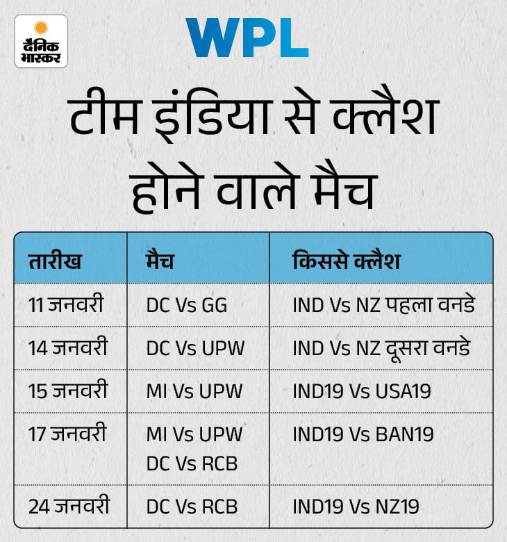 6 मैच टीम इंडिया के मुकाबलों से क्लैश होंगे विमेंस प्रीमियर लीग के 6 मैच भारतीय मेंस टीम से क्लैश होंगे। इनमें से 2 मैच शुभमन गिल की कप्तानी वाली टीम इंडिया से क्लैश होंगे। जबकि, 4 मैच अंडर-19 टीम इंडिया के मुकाबलों से क्लैश होंगे।