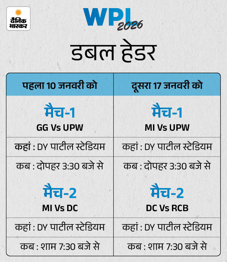 इस बार 2 डबल हेडर होंगे विमेंस प्रीमियर लीग के मौजूदा सीजन में 2 डबल हेडर होंगे। डबल हेडर यानी एक दिन में दो मैच। पहला डबल हेडर 10 जनवरी होगा, जबकि दूसरा 17 जनवरी को होगा।