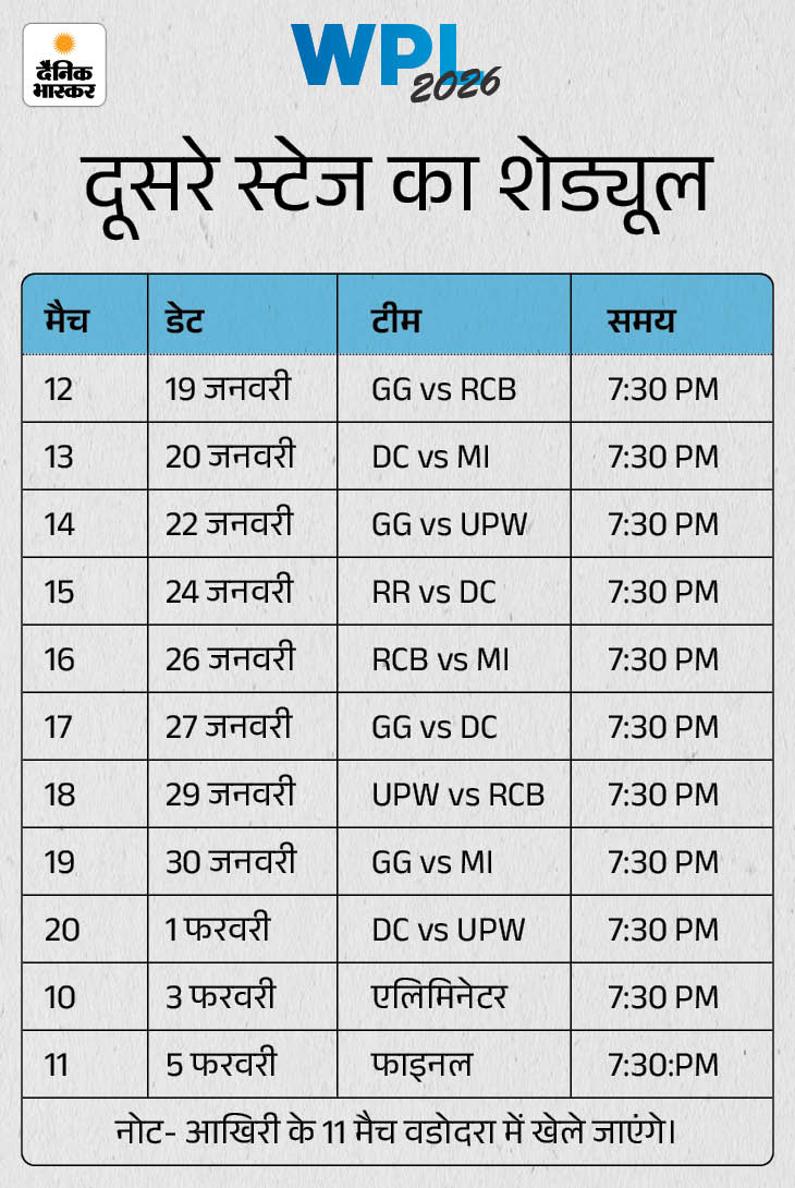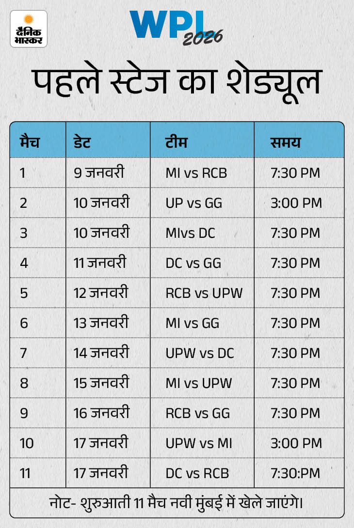 कब और कहां देखें WPL के मैच? WPL का लाइव टेलीकास्ट स्टार नेटवर्क पर होगा। मुकाबलों की ऑनलाइन स्ट्रीमिंग जियोहॉटस्टार ऐप पर होगी। WPL 2026 में रात के सभी मैच शाम 7:30 बजे से शुरू होंगे। टॉस शाम 7 बजे होगा। वहीं डबल हेडर वाले दिन पहला मैच दोपहर 3.30 बजे शुरू होगा। टूर्नामेंट की पल-पल अपडेट्स के लिए आप दैनिक भास्कर ऐप को फॉलो कर सकते हैं।